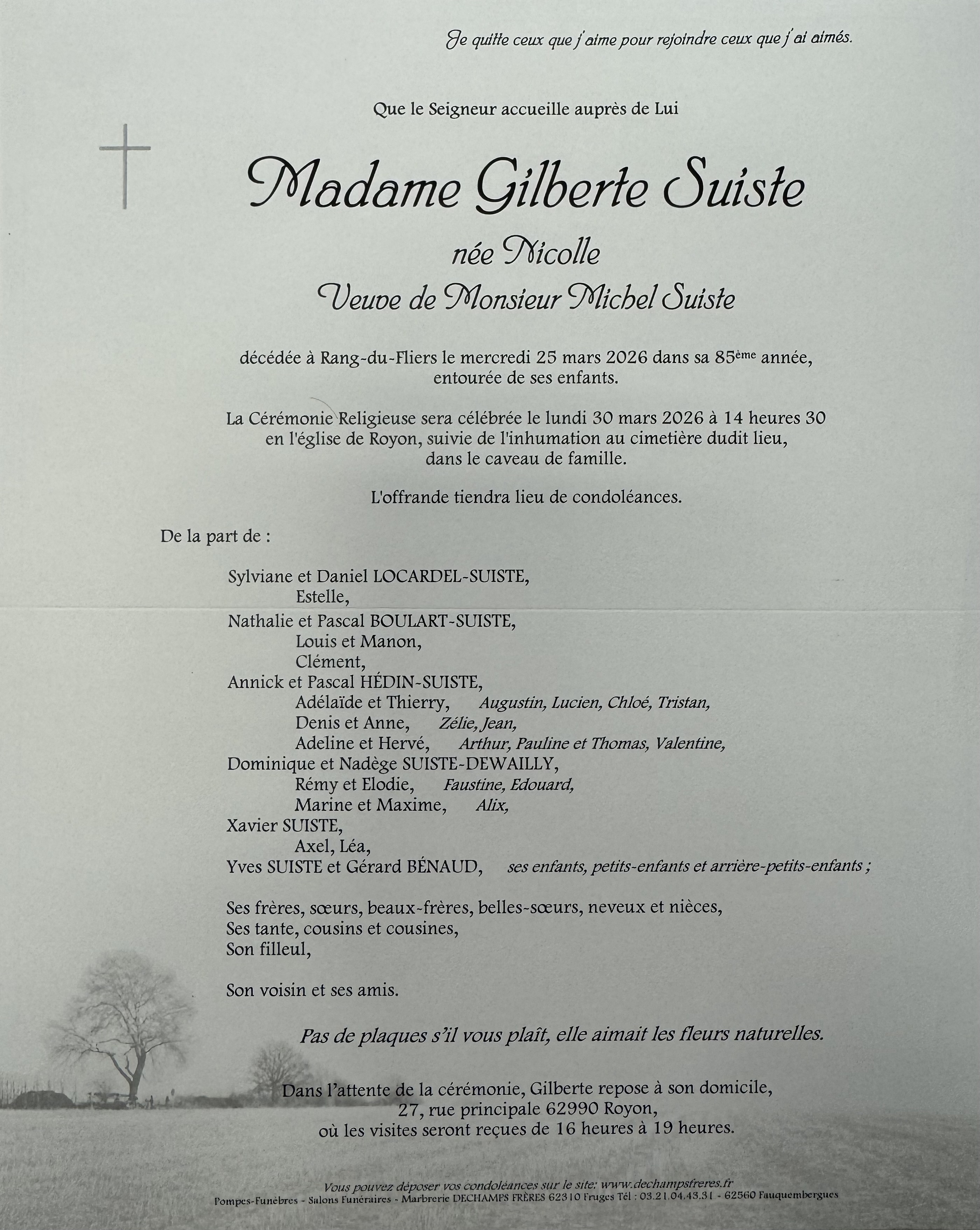 C’est avec une grande tristesse que nous vous annonçons le décès de Gilberte SUISTE survenu le mercredi 25 mars 2026 à Rang-du-Fliers. La cérémonie se déroulera le lundi 30 mars 2026 à 14h30 à l’adresse suivante : Église Saint Germain - 62990 Royon.